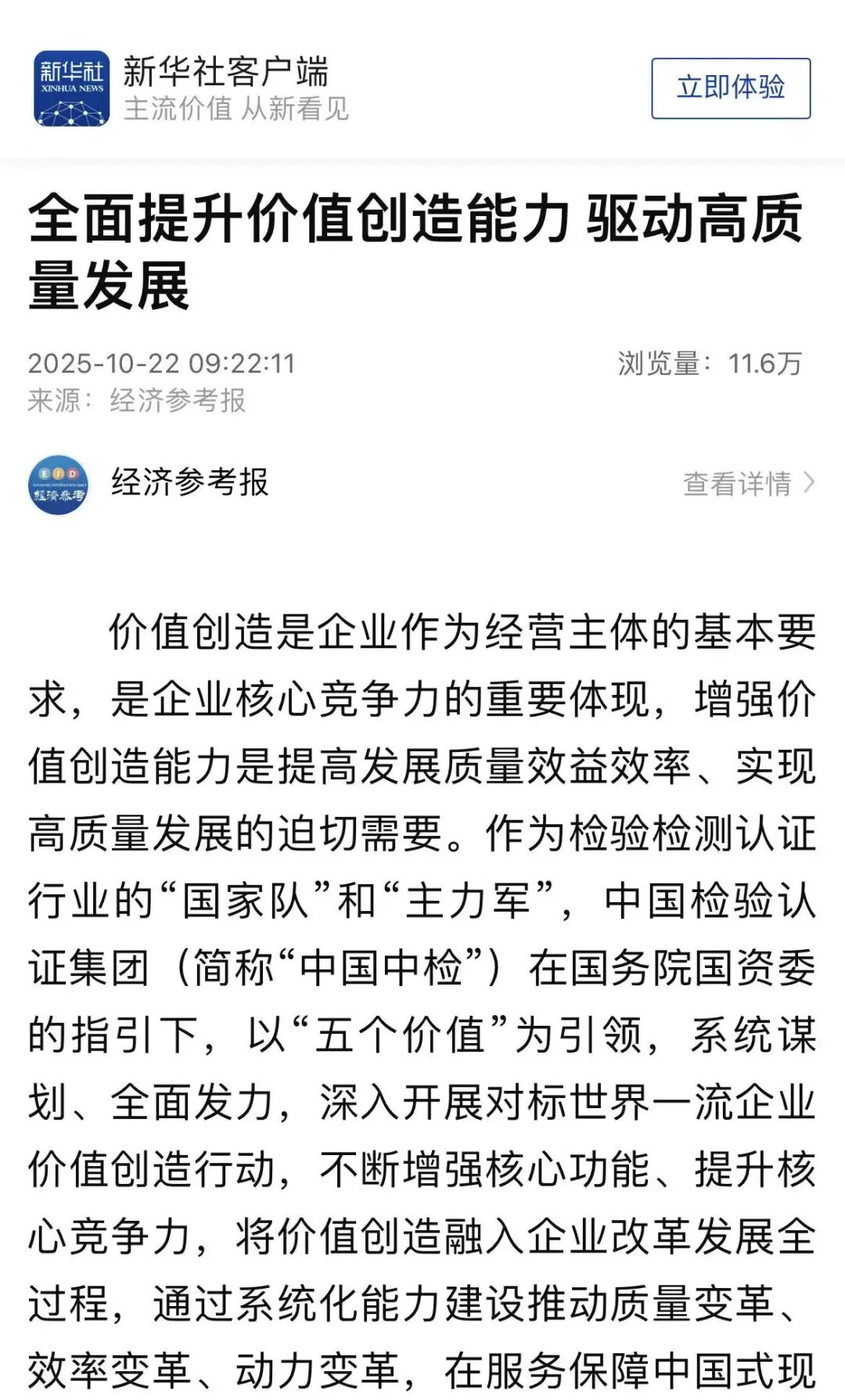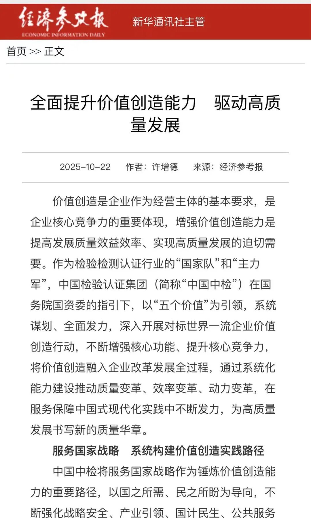 近日,新华社客户端、经济参考报、经济参考报网站刊登中国检验认证(集团)有限公司党委书记、董事长许增德署名文章《全面提升价值创造能力 驱动高质量发展》。文章从服务国家战略、聚焦效益效率、强化创新驱动、践行社会责任等方面阐述了中国中检在全面提升价值创造能力中不断增强核心功能、提升核心竞争力,实现高质量发展的担当作为。以下为相关版面及链接。